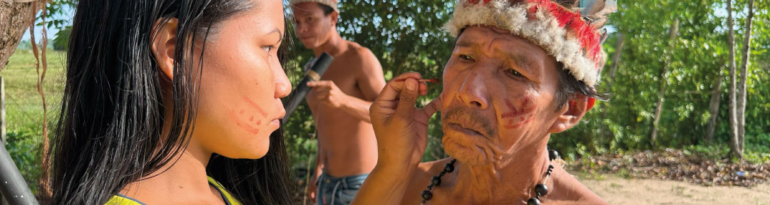 Se emplean pinturas naturales para trazar símbolos en el rostro, representativos de la riqueza cultural y espiritual del pueblo Cubeo, cada diseño cargado de significado y tradición ancestral.